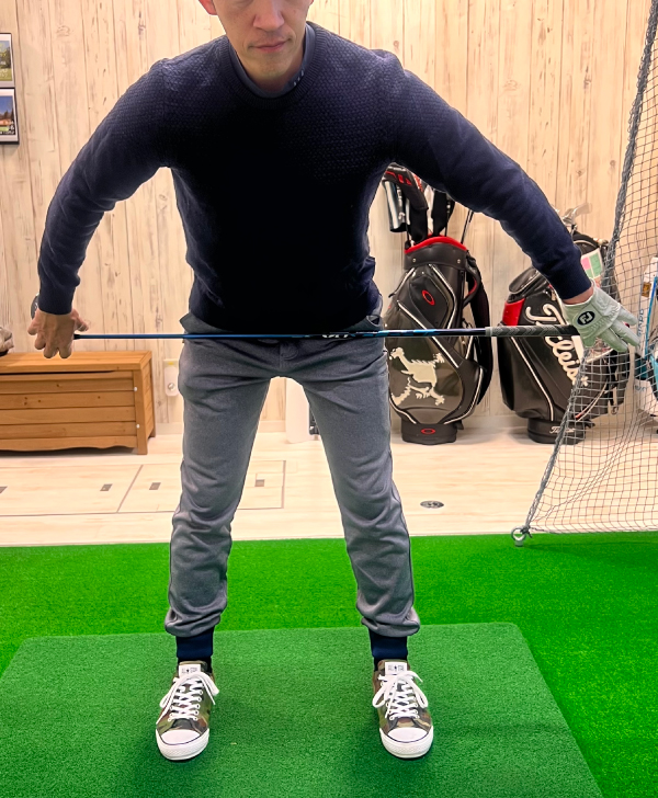 正しい前傾を取れていれば、そこから腕をダラーンと真下に落とした位置でクラブを握れば型の可動域が一番大きな状態になるので自然とスイングが早くなります。腕が体に近くなると、可動域が狭くなるので身体を回しきれずに手打ちになりやすく、腕が体から遠くになると脇が開いてインパクトで力が伝わらない形になりやすいので肩から真っすぐ糸を垂らしたような腕の形を意識してください。
