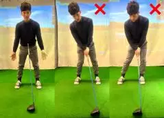 意識のポイントをおへそにしてみることをおすすめします。おへそに真っすぐクラブを当てて、ソールが地面と平行になるまで前傾をしてみましょう。そこから角度を変えないように真っすぐ手を下ろせば綺麗な前傾を維持できます。