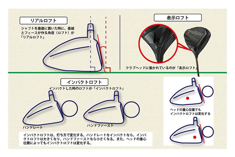 インパクトロフトは打ち方で変化します。ハンドファーストの形でインパクトすれば、インパクトロフトは少なくなり、ハンドレイトの形でインパクトすればインパクトロフトは大きくなります。また、ヘッドの重心位置によっても変化しますが、この部分のお話は重心位置の回に詳しく説明します。