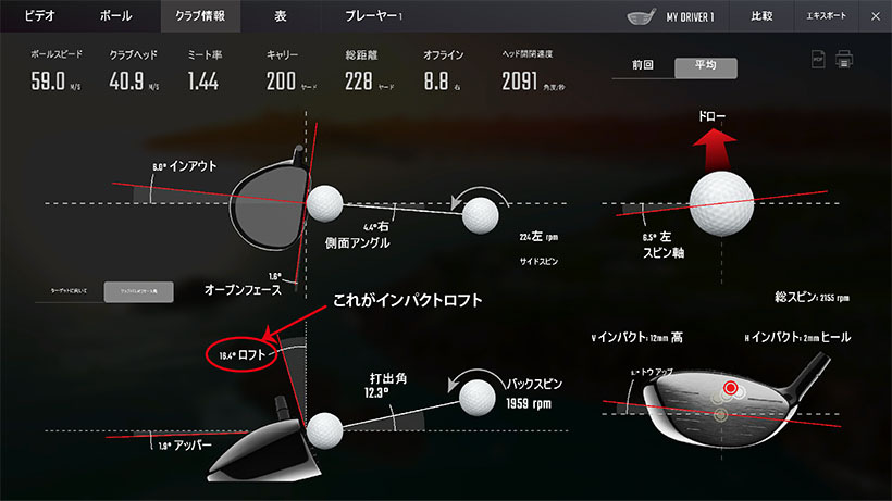 ヘッドピードによって変化しますが、ヘッドスピード40〜45m/sくらいの場合は、打ち出し角16度前後、バックスピンが2200回転前後の組み合わせが“おいしい”組み合わせです。球の打ち出し角はインパクトロフトより少し低くなりますから、打ち出し角16度前後を得るためには、インパクトロフトが18度前後になるクラブを選ぶことが効率よく飛ばすために重要というわけです。