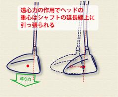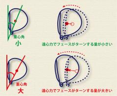 スイング中にヘッドには遠心力がかかり、ヘッドの重心はシャフトの延長線上に引っ張られます。重心角が大きいとこの作用でフェースが自然と左にターンする動きが起こります。
