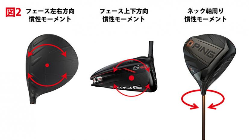 クラブヘッドの慣性モーメントと言った場合、一般的にはソールを下にしてヘッドを置いた状態で、地面と垂直な回転軸に対する慣性モーメントを指します(フェース左右方向の慣性モーメント)。このほかにも、フェース上下方向の慣性モーメントとネック軸周り慣性モーメントもあり、これら3つが打球の打ち出し方向や初速に影響します。