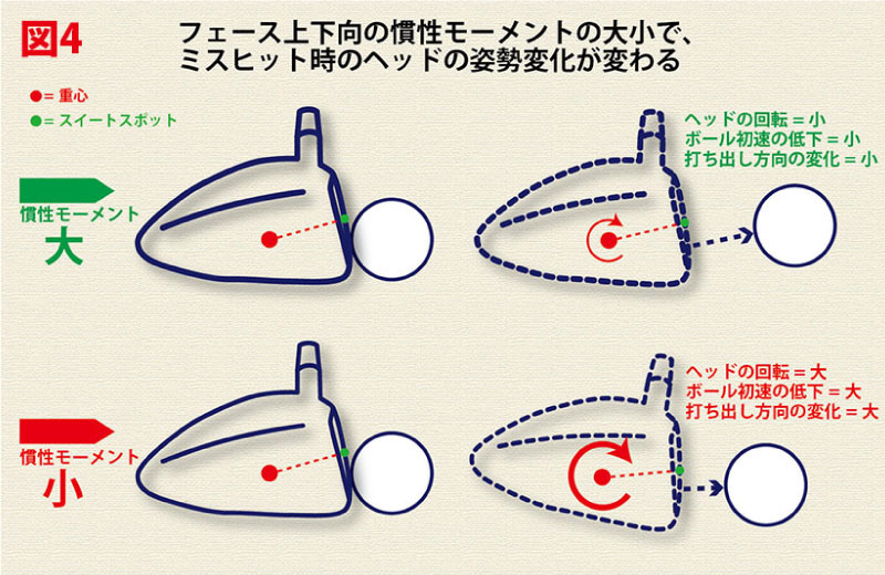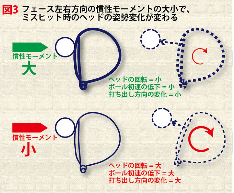 慣性モーメントが大きいほどヘッドは回転にくく、慣性モーメントが小さいとヘッドが回転しやすくなりますから、図3のように、トゥ側でミスヒットしたときでも慣性モーメントが大きければ、フェースの向きが変わりにくくなります。また、インパクトでヘッドの回転が大きくなると、インパクトのエネルギーがヘッドの回転に浪費されますから、ヘッドの回転は小さいほど、ミスヒットのボール初速の低下が少なくて済む=飛距離のロスが少なく、方向安定性も高いというわけです。
