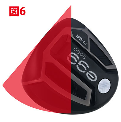 一般的には、重心がヘッドの奥にあるヘッドは重心角が大きく、重心の位置がフェースに近いヘッドは重心角が小さくなる傾向があります。慣れれば図6のようにクラブを置いて見れば肉眼でも重心角の差は分かります。