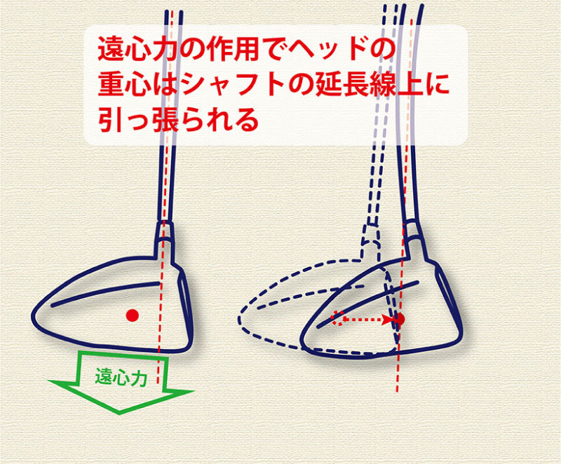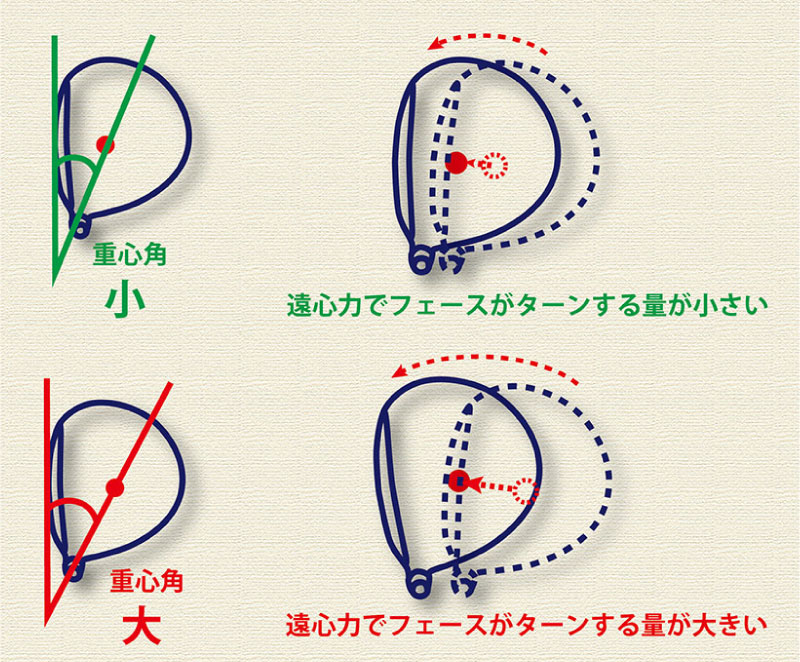 スイング中にヘッドには遠心力がかかり、ヘッドの重心はシャフトの延長線上に引っ張られます。重心角が大きいとこの作用でフェースが自然と左にターンする動きが起こります。