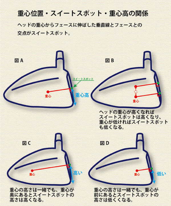 ヘッド内部の重心からフェースに垂線を下した時の交点がフェース面上のスイートスポットです(図A)。するとアイアンはヘッド内の重心の高さとスイートスポットの高さがほぼ連動しますが、ウッドの場合は重心深度が深いほどフェース面上のスイートスポットは高くなります(図C、D)。