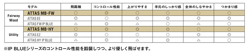 東レの新素材「トレカ(R)M40X」をシャフト先端部に採用することでインパクト時に適正なロフトをキープし、高弾道を実現。アッタス MB-FWは、クセのない全体しなりでコントロール性能を重視しつつ、スピード感と振り抜きの良さを高め、アッタス MB-HYは、先端剛性を保ちつつ「トレカ(R)M40X」が強い弾きを生み出し、高弾道と振り抜きの良さを実現した次世代モデルとなっている。