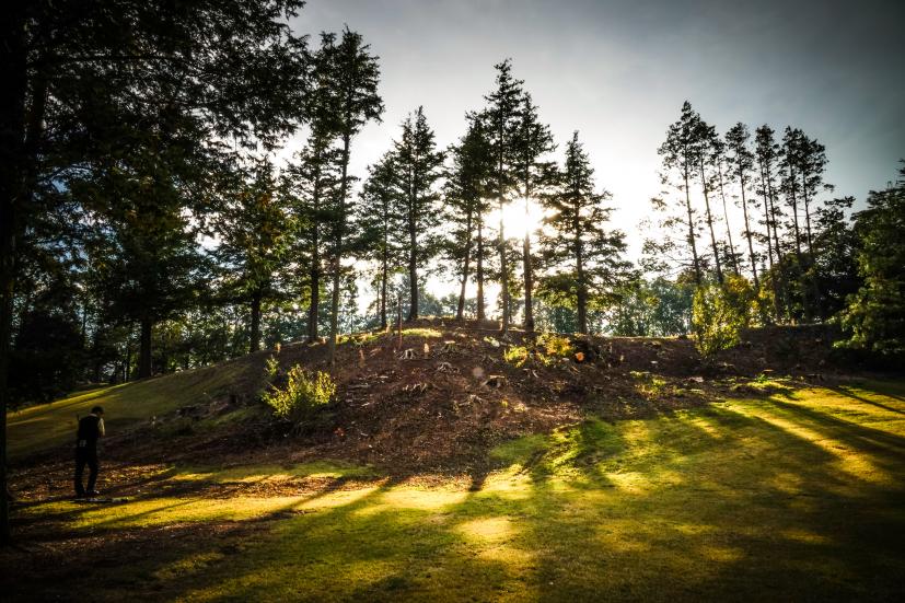 もうずーっとここで影の移ろいを見てたかった。用語集にも書いてますけど、やっぱり『振り返りのススメ』なのです。振り返って見たほうが圧倒的に美しいことが多いのです。このときは、本来なら打つ人の前にいたらダメだけど、男性が2オン狙いだったのと、わたしがまんまと右のお山方面に打ったのが重なって、この位置から振り返ることになりました。ミスショットしてよかったわー。フェアウェイにいたらこれには気づかなかったですきっと。あーよかった。