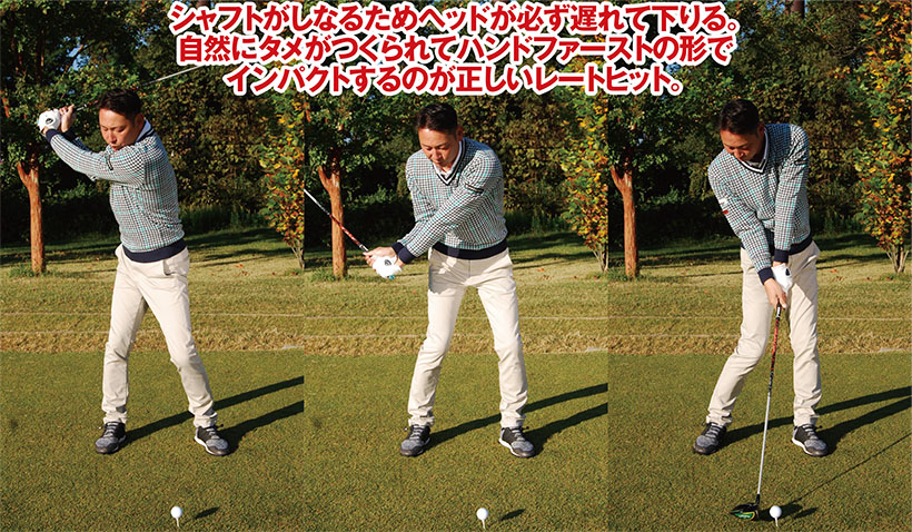 ダウンスイングではシャフトがしなりますから、クラブヘッドは必ず後から下りてきます。レートヒットは自然な動きというわけですが、ダウンスイングでは自分が想像している以上にフェースが開いて下りてきます。