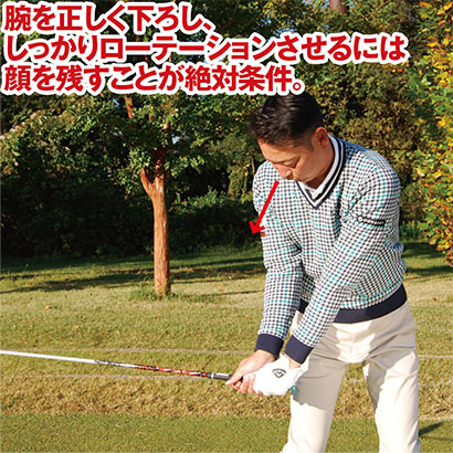 実は腕のローテーションは顔と連動していて、顔がしっかり残っていないと腕のローテーションができないのです。顔が早く目標を向くと胸も早く開き、左ワキがあいて腕をスムーズに返せなくなります。