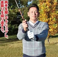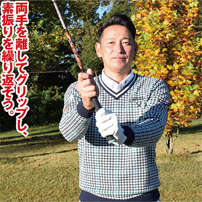 レートヒットのダウンスイングをマスターするには、両手を10〜15センチほど離してグリップするスプリットハンドドリルがオススメです。