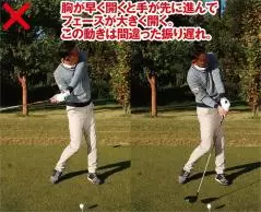 ところがダウンスイングで胸が早く開いてしまうと手がどんどん先に行って、クラブヘッドが遅れすぎてしまいます。そのためインパクトで間に合わなくなり、フェースが開いて当たってしまうのです。これが「間違った振り遅れ」です。