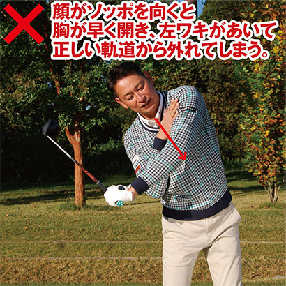 この練習をすると顔や胸が早く目標を向くと左ワキがあいて、腕のローテーションがスムーズにいかないこともよくわかるはずです。