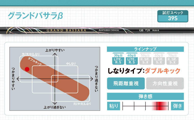 先しなりに加えてシャフトの手元側も少ししなるダブルキックタイプです。中間部の硬さでヘッドが地面と平行移動するように抜けるので球が適度につかまり、打ち出しはやや高め。厚いインパクトでミスヒットにも強い。