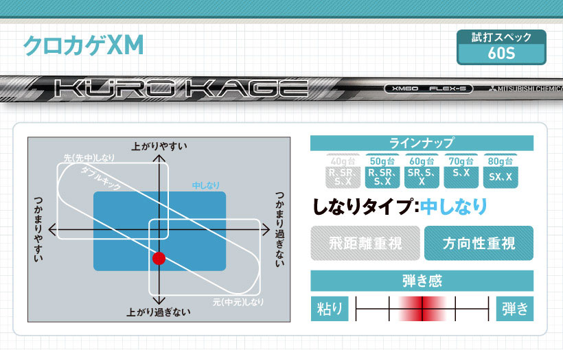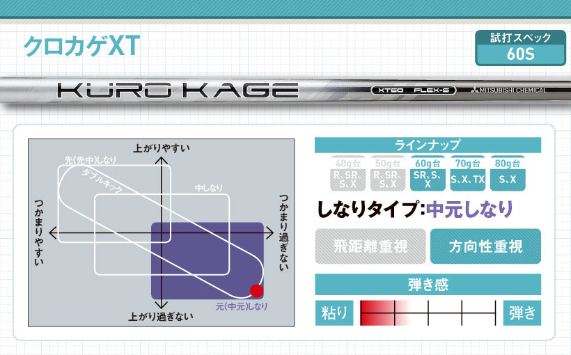 手元側のしなりでタメを作りやすく、つかまり過ぎと上がりすぎを控えるクロカゲシリーズの中では少しつかまるモデル。手元側の剛性を少し高めて扱いやすさをプラス。球の打ち出しはやや低めながら、球のつかまりはニュートラルになります。