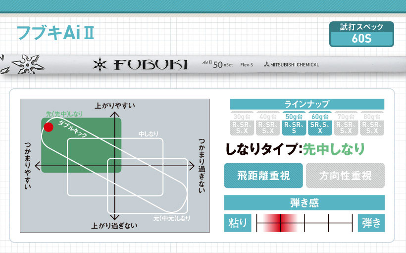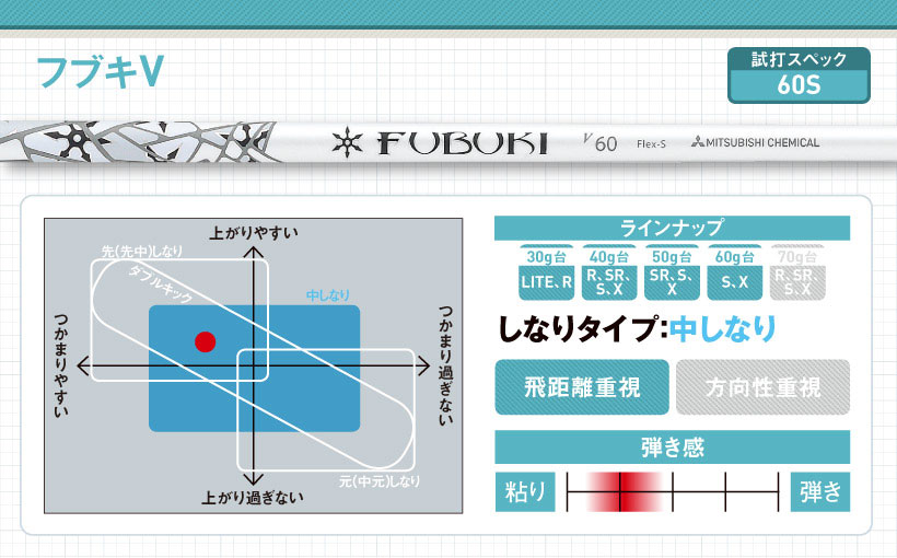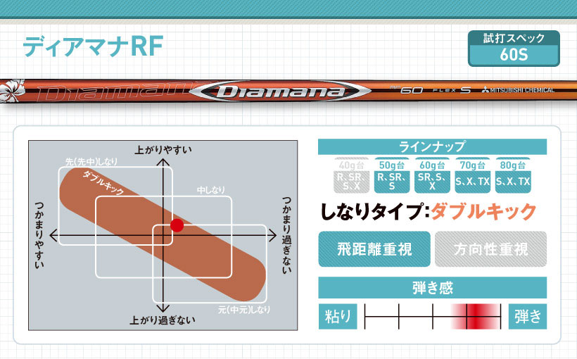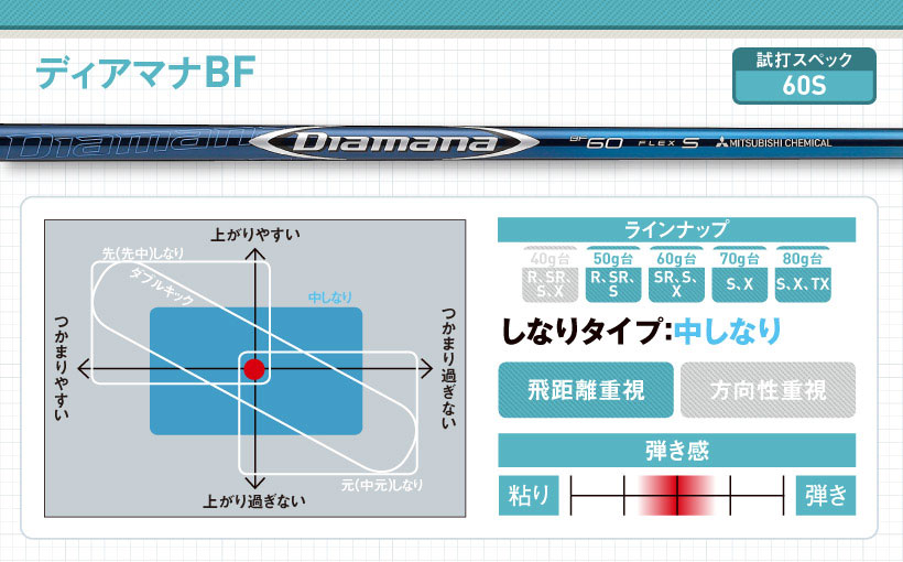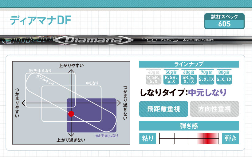 ディアマナWシリーズの後継モデル。手元側がしなるタイプですが、グリップ部分の剛性感があるので、球のつかまりも少し持っています。先端部分のしなりが少ないので、インパクトロフトが立ち、低めの強い球が出ます。
