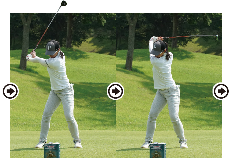 ベタ足スイングを意識すると体が止まってしまうが、左足をめくれないよう意識することで、体の動きを止めることなくスイングできている。