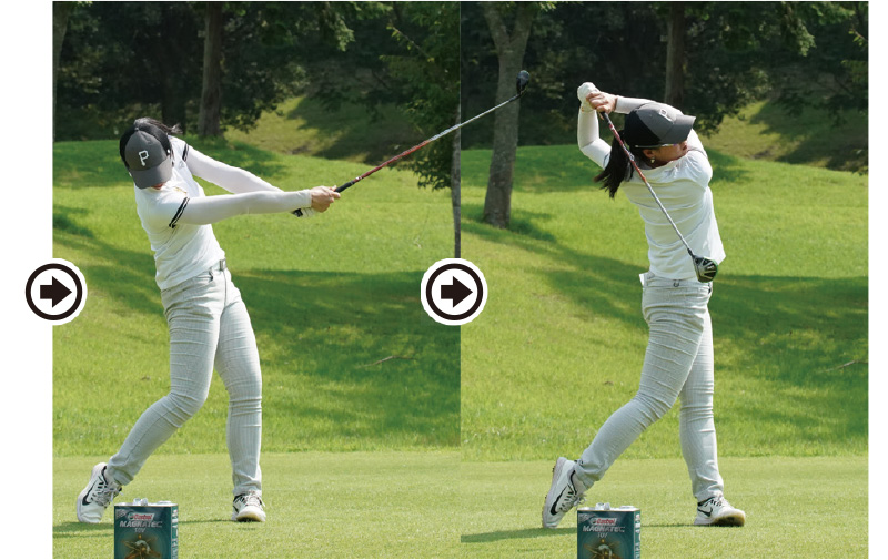 フィニッシュで重心が後方に残っている。右足に残すことで、ヘッド軌道はアッパーになり、球の滞空時間が長くなるので飛距離アップができる。