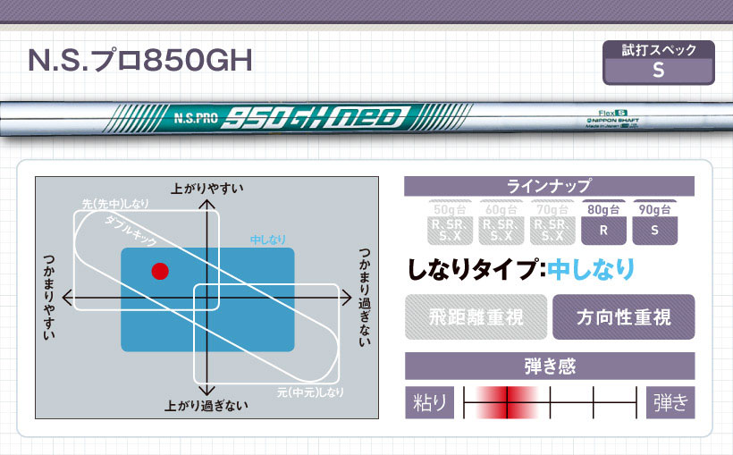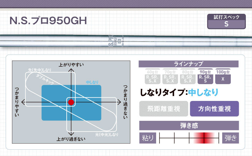 従来のN.S.950GHと比べると中間部のしっかり感と手元部分のしなり感が少しプラスされました。インパクトロフトが増えて高打ち出しでもスピンは増えず、ストロングロフトに対応。“間”の取りやすさも向上しました。