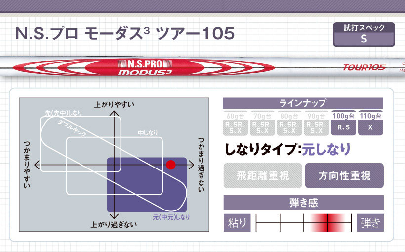 ツアータイプのスチールシャフトの特性を持った軽量モデルです。軽くなった分“張り感”が増すので、しなりを感じやすいように、フレックスを下げる、長尺にする、バランスを上げるのいずれかにすると本来の性能を発揮しやすい。