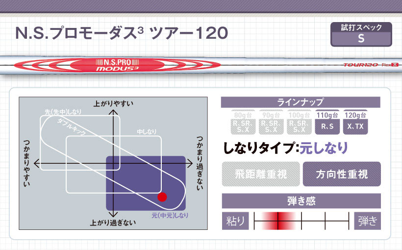 発売から20年目を迎える超ロングセラーシャフトです。中庸な球のつかまりと高さ、素直なしなり、少し弾いてヘッドも加速してくれる。振りやすさと飛距離性能を備えた、軽量スチールの代名詞といえるモデルです。