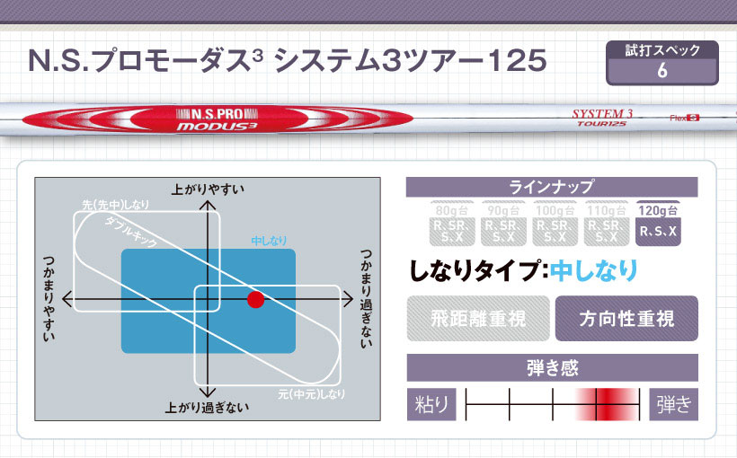 基本的には、シャフトの中間から手元側がしなってタメを生むツアー系シャフトの挙動ですが、弾きでヘッドの加速性をプラスしています。ツアー系シャフトとしては打ち出しが少し高めとなるがスピンは増えない。