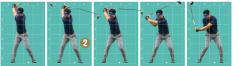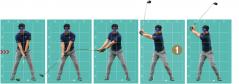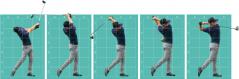 足のハの字がインパクト後までキープされていることでもわかるように、横の動きと言っても、右から左に揺さぶるわけではなくあくまでもスタンスの範囲内です。完全に左足に乗るのはインパクト後、フィニッシュに近いタイミングです。アマチュアの方は、インパクトですでに左足が伸び上がりがちなので、このイメージを参考にしましょう。
