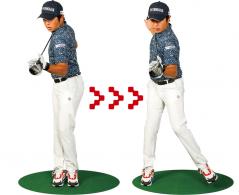 スタンス幅の範囲内で、飛距離のパワーを生む石川の横の動きのポイントは、まずバックスイングで右の股関節でシャフトを挟めるくらい回旋すること。左への移動のイメージは、右足荷重で立ち、左足を踏み込む素振りが有効です。また、ダウンで左ヒジが外を向くとフェースが開くので、下に向けるイメージで振りましょう。