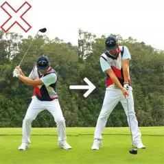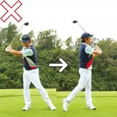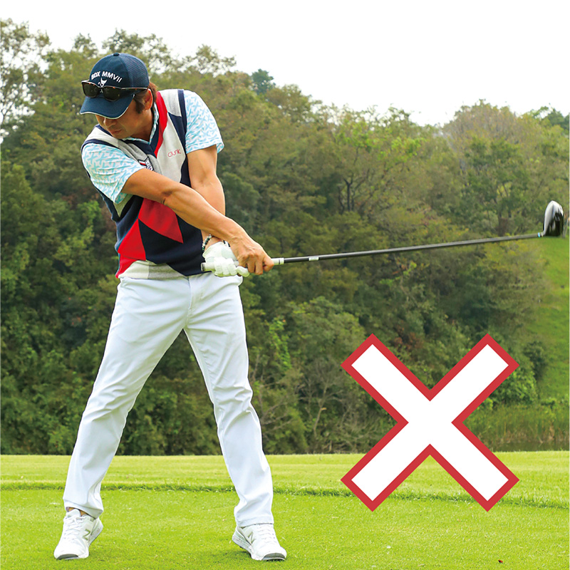 右腕と左腕が同一方向に動いているスイング。一見、問題ないように見えるが、捻転差がないためパワーが生まれない。また、スエーが起きやすく、スイング軸が傾きやすい。