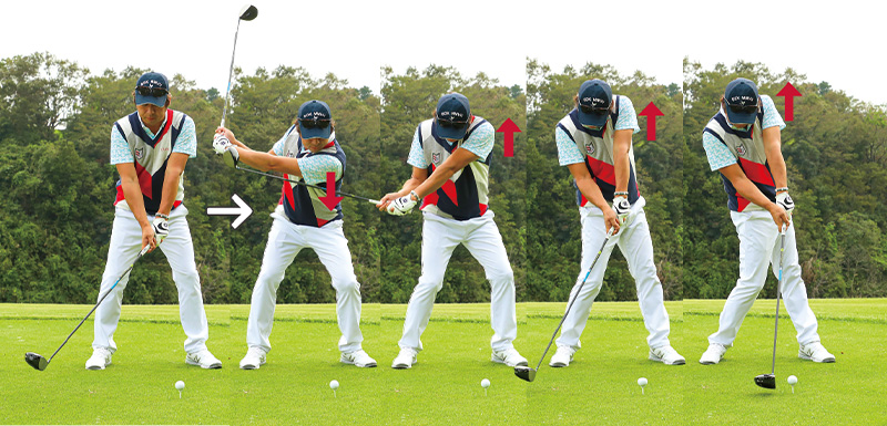 左腕をバックスイングで下方向、ダウンスイングでは上方向に動かすことで、左右の腕が別方向に動き、上半身と下半身も別方向に動く。この左右と上下が分離して動くことが、安定してパワーを出すスイングの秘密だ。