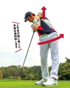 左腕を上下に動かすことで、上半身は縦回転し、下半身はそれに連動して、自然と横回転します。