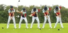 このとき、カラダの左右、上下、そして前後も別方向に分離して動いています。分離して動くことで、バランスが保たれるから、スイングが安定するのです。分離というと、バラバラに動いてしまうよう上半身リードが出来れば、スイングが安定するに聞こえますが、実際には、同方向に揃って動くほうが、スエーしやすく、力も出しにくいのです。