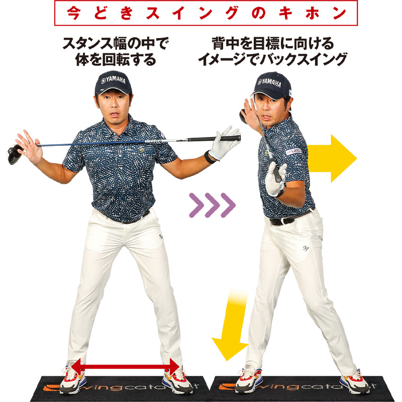 しかし現在のクラブはヘッドの大型化と軽量化、それに反発力の向上がこれだけ進んだため、左右の動きをできるだけ抑えて、構えたその場で体をターンするほうが合理的と考えられています。
