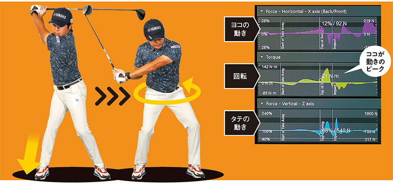 トップからダウンスイングへの切り返しから3つの動作が順に作動しますが、ゴルファーによって3つの動きのピークに違いが見られることがデータ検証で解明されています。