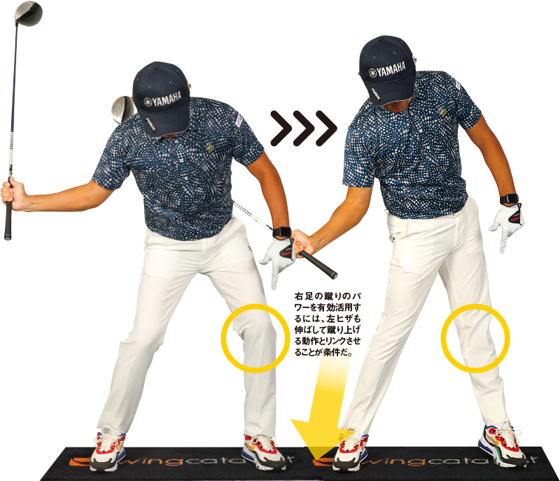 右足の蹴りは縦方向の動きですが、右足単独の動きではありません。ダウンスイングからインパクトにかけて左のお尻を後ろに引いて左ヒザを一気に伸ばす動作と連動して、右足の強い蹴り上げのパワーを引き出すのです。このイメージが強い人ほどジャンプアップするような動きとなり、インパクトで両足が少しツマ先立ちます。