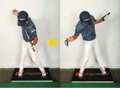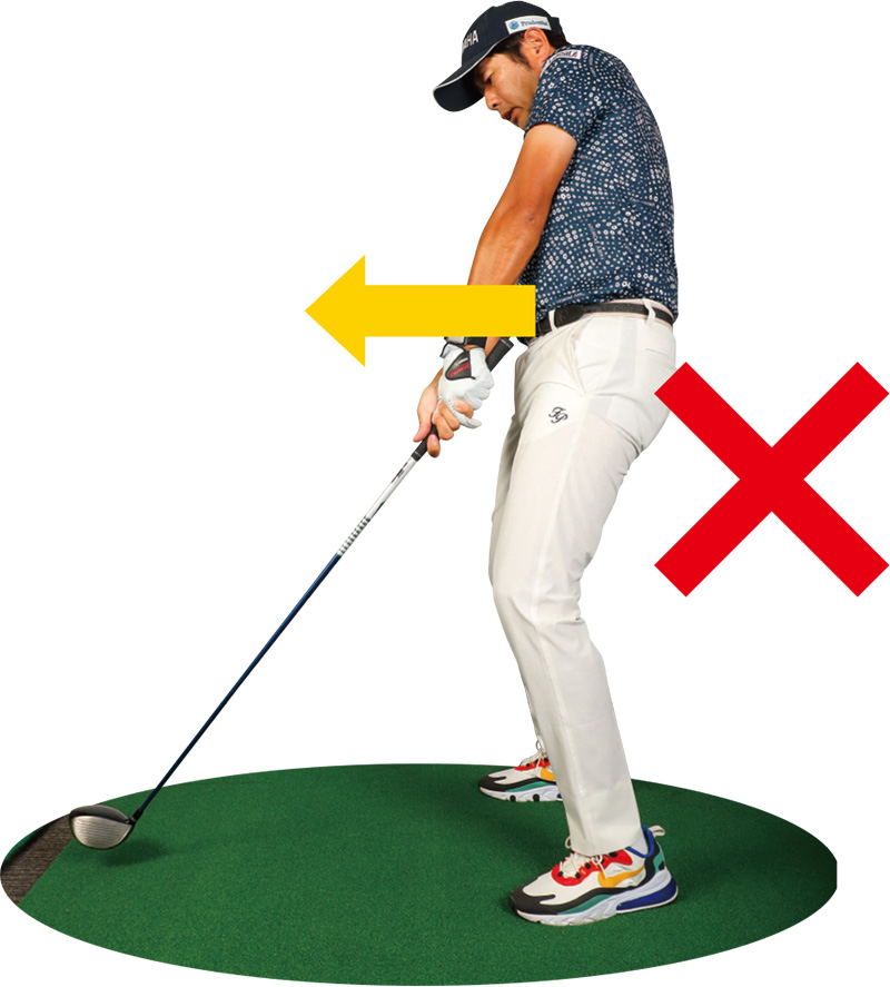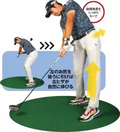 地面からのパワーを吸収することでヘッドスピードが上がりますが、お腹を前に出さないで前傾角度をキープすることが絶対条件です。