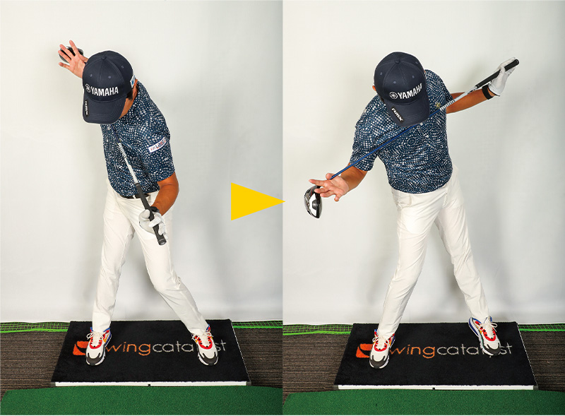 クラブを胸の前に持ってバックスイング方向に体を回し、ダウンスイングでは左足をツマ先立てながら背中側に少し引きずります。体を軽くジャンプさせる感覚ですが、右足の蹴りは左カカトを少し浮かせて右足に圧力の負荷をかけるイメージです。
