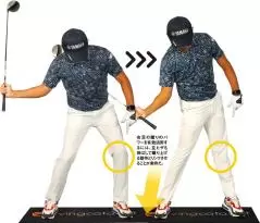 ダウンスイングの始動では左ヒザが曲がっているけど、左ヒザをピンと伸ばせば右足の蹴り上げがスムーズにいく