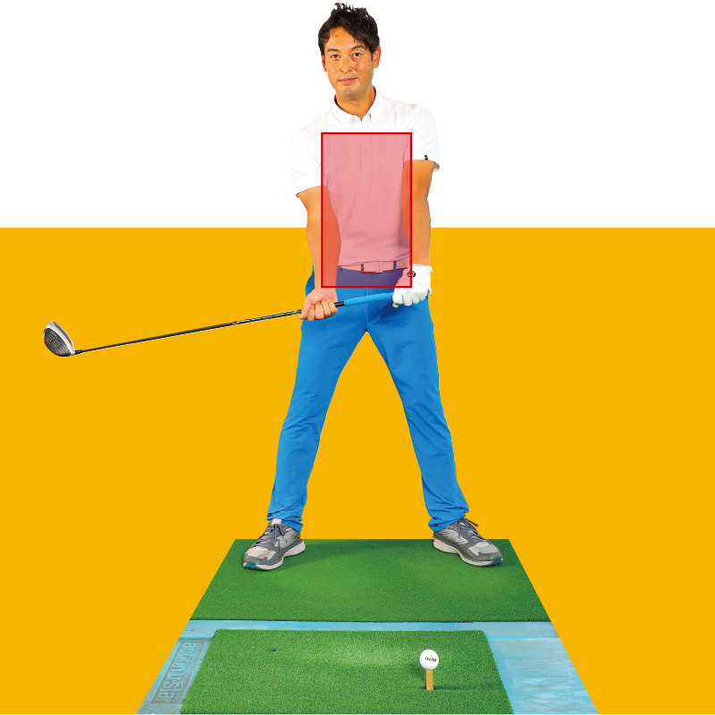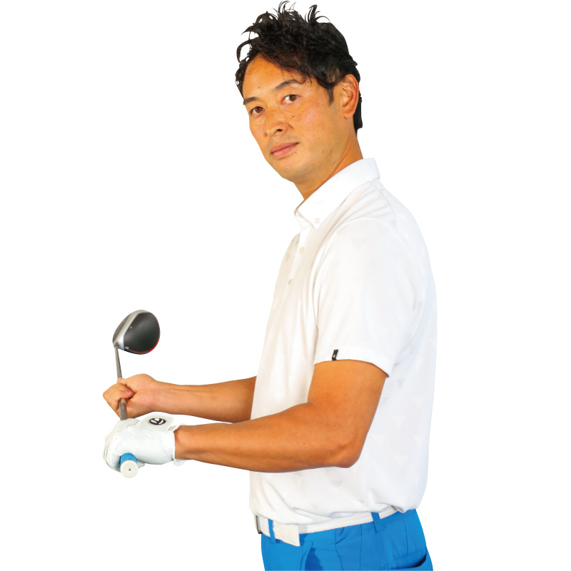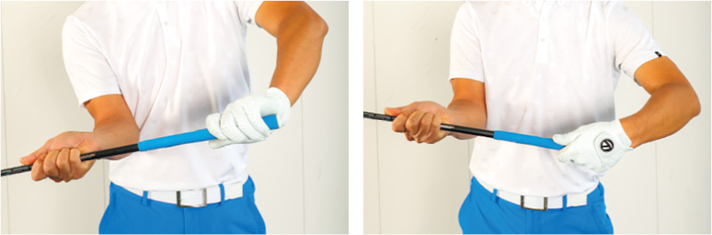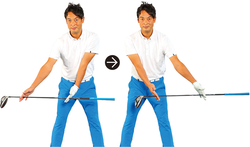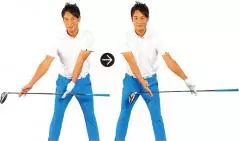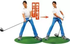 両手でクラブを吊って持つイメージと体の回転運動を合体させる。
