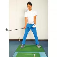 構える時は真っすぐに立ち、両手の間隔を空けて腕を90度に曲げ、左手甲が上、右手甲が下を向くようにクラブを持ちます。そして、そのままヒジを伸ばしてクラブを体の前に垂らす。こうすると二点でクラブが吊られて(二点吊り子)肩と腕とクラブで四角形ができます。