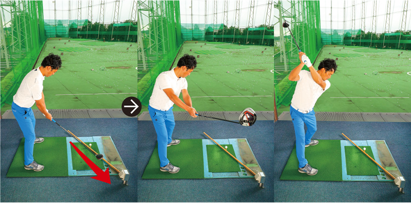 フォワードプレスをしたら、やることは体を右に回すだけ。ポイントを挙げるなら、クラブのバランスポイントを、真っすぐ右に動かすようにテークバックしてバックスイングに移ること。体の右回転が伴わないとクラブはアウトサイドに上がります。