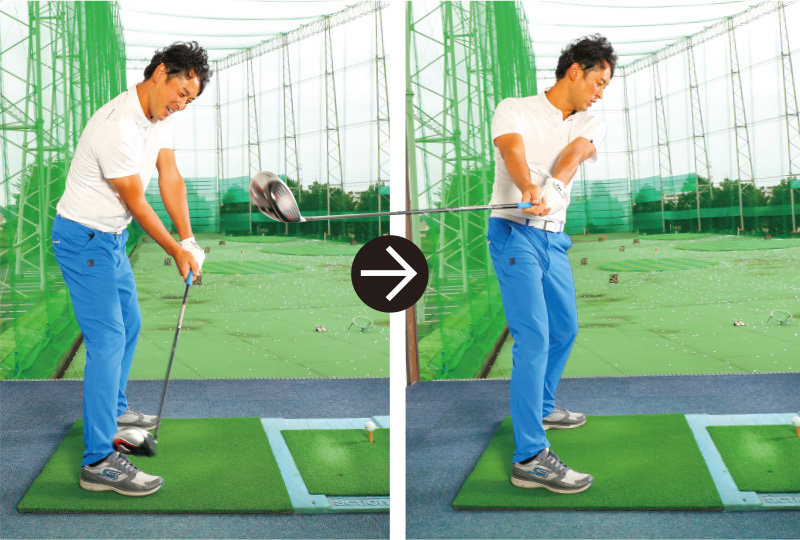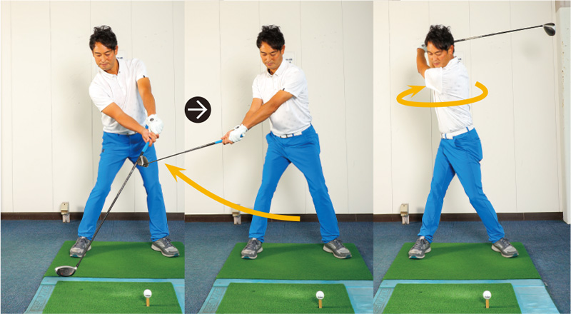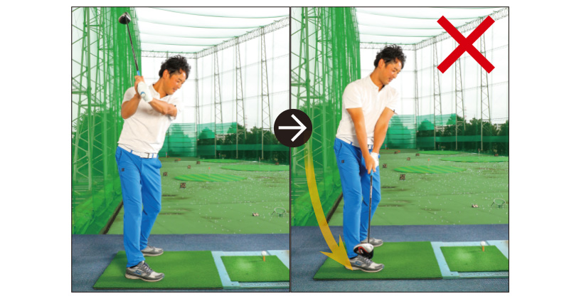 気をつけるのは胸を起さないこと。左への回転力がなくなるので、ダウンスイングでは胸を下に向けるようにします。