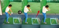 体を回さずクラブだけを二点吊り子で動かすとヘッドはアウトに上がっていく。体の回転が伴ってもインサイドに引かれることはない。