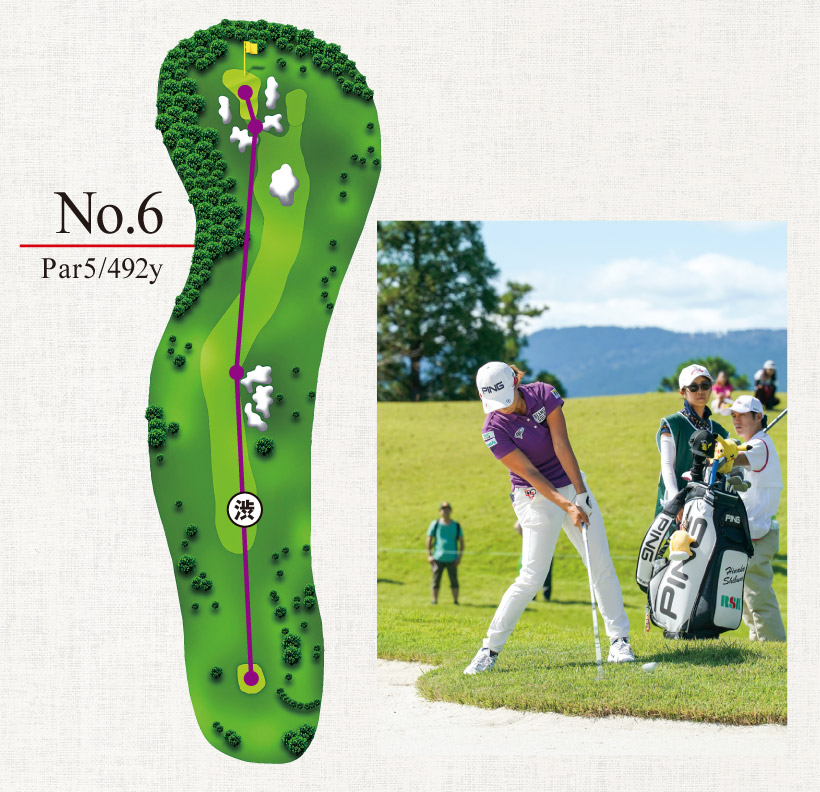 6番ホールはパー5だが最終日の平均スコアはオーバーパー。グリーン周りにはバンカーが密集し、2打目でグリーンを狙うラインが狭い。グリーンも大きな3段グリーンで渋野は3打目のアプローチが短く、長いバーディパットを外してパーセーブとなってしまった。