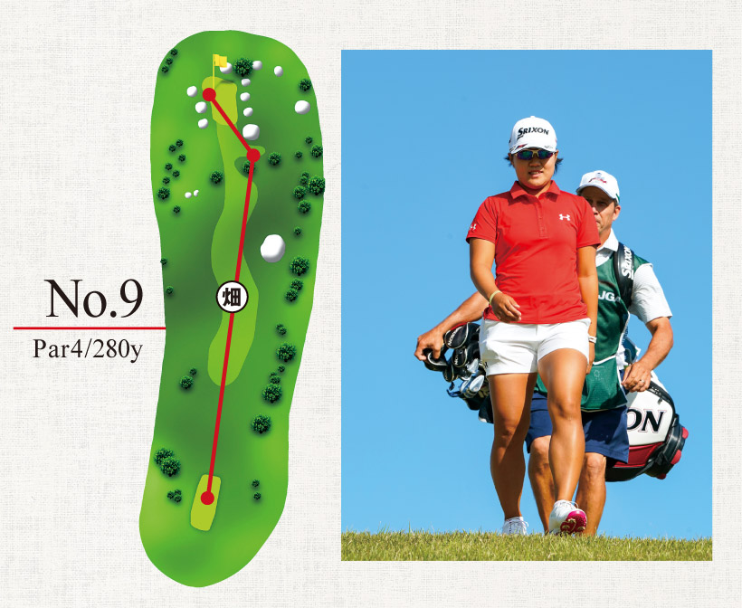 最終日の9番はワンオンが狙える280ヤードのパー4。果敢にドライバーで攻める選手が多かった。しかし、最終組の3組前を回っていた名手・申ジエが痛恨のボギーを打つほど難易度が高いホールで、畑岡もティショットをミスして右の木に当ててしまう。ピンまで約60ヤードという微妙な距離が残った。現場で解説をつとめていた森口祐子は、
