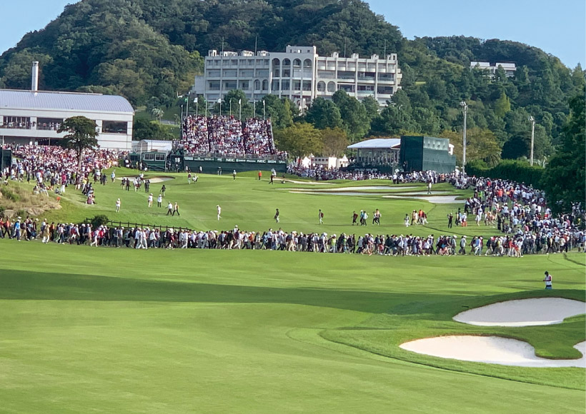 三重県の「COCOPAリゾートクラブ白山ヴィレッジゴルフコースQUEENコース」で開催された大会では4日間の入場者数が約4万6000人。最終日だけで1万6000人を超える大ギャラリーがつめかけた。写真は渋野日向子が18番に来たときのワンシーン。