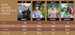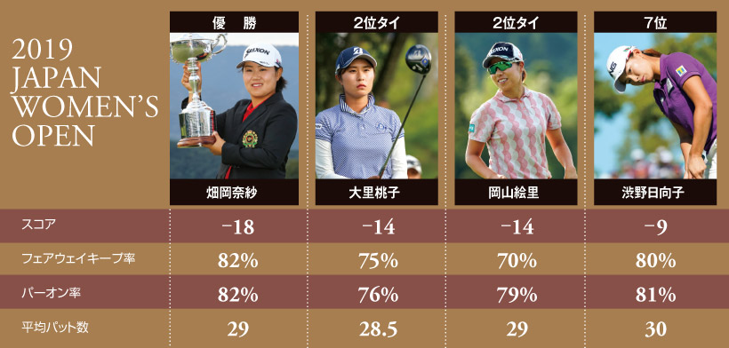 ハイスコアの争いとなった「日本女子オープン」だが、4日間連続での60台をマークしたのは畑岡奈紗、ただ一人だけ。畑岡はフェアウェイキープ率、パーオン率ともに4日間トータルで80%を超える抜群の安定感を見せていた。実は7位の渋野も大会中には「ショットの調子はすごく良い」と語っていた通り、畑岡同様にフェアウェイキープ率、パーオン率ともに80%を超えていた。しかし、最終日に惜しいパットを外す場面も多く、スコアを伸ばしきれなかった。
