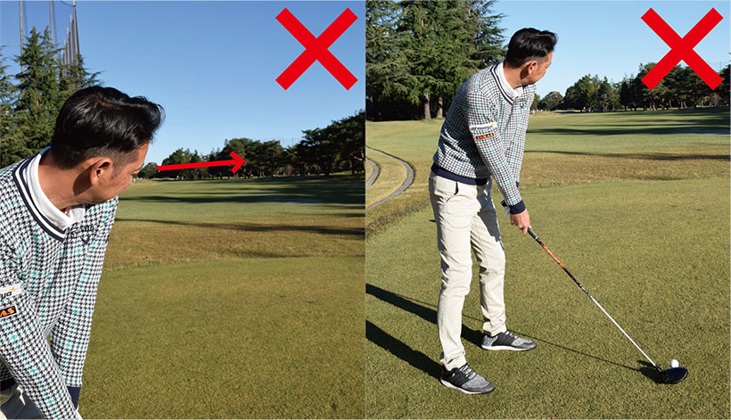ボールと目標を結ぶ飛球線を明確にイメージし、飛球線に対して肩や腰、スタンスを平行にセットすれば正しいアドレスが作れたはずなのに、左肩越しに遠くの目標を見ると体が開いて見えてしまい、本能的に体を右に向け直してしまうのです。