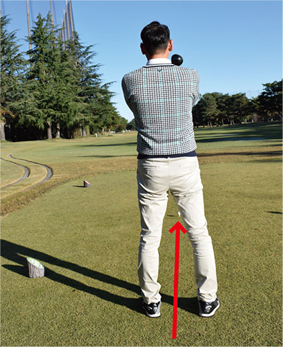 4.最後に両ヒザを軽く曲げてアドレスが完成。体重配分はドライバーショットの場合、右足6、左足4が目安