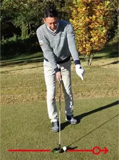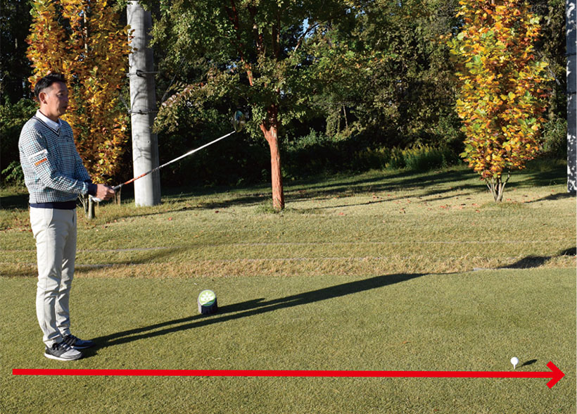 ボールの真後ろから目標を見るのではなくて、飛球線のやや左側に立つということ。ボールと目標を結ぶ飛球線をしっかりイメージした上で、その飛球線が自分よりも右に見えるようにしておくのです。